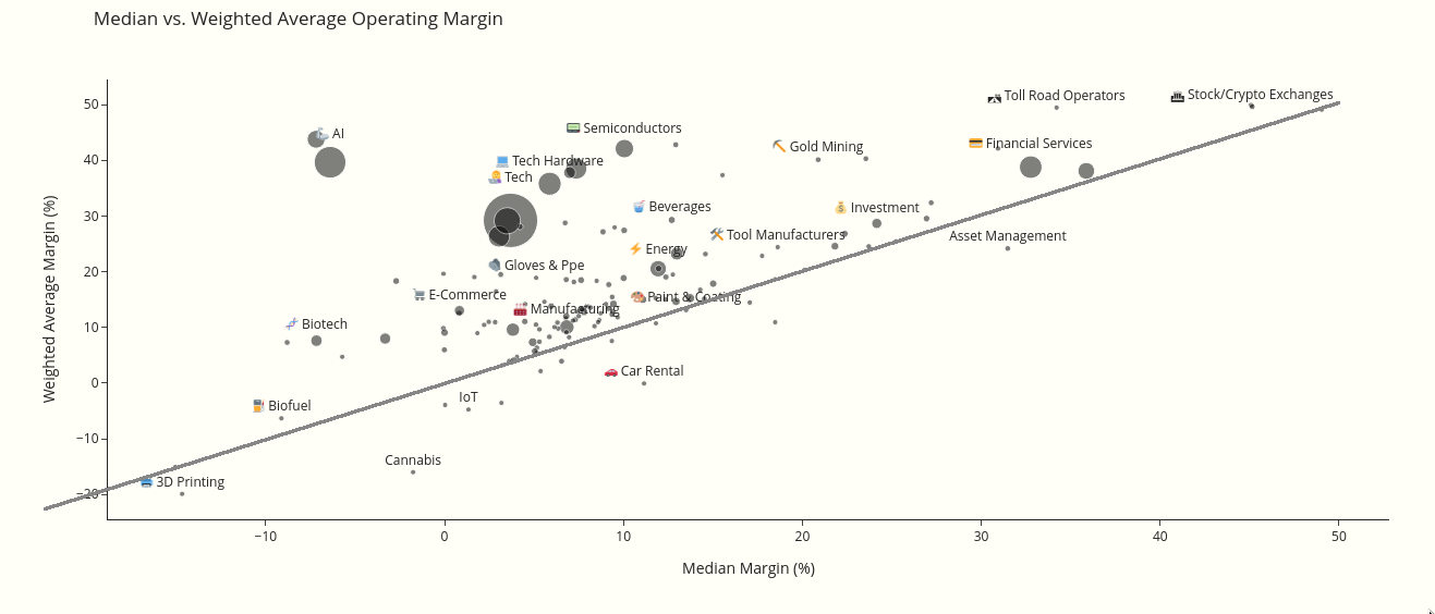 The article found that the highest margins are in ports, financial services, toll roads, etc. with certain key (but not all) software, AI, and semiconductors having good margins. But this is a logical consequence of the definition of margin they chose. These are all very capital-intensive businesses: it takes a huge amount of money to build a port, or a fab, or a search engine, or a road, or to start up a bank or insurance company. The financing cost of building these capital improvements, as well as the depreciation on them, is explicitly excluded from the definition of "margin" that the article chose.